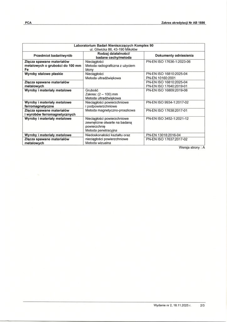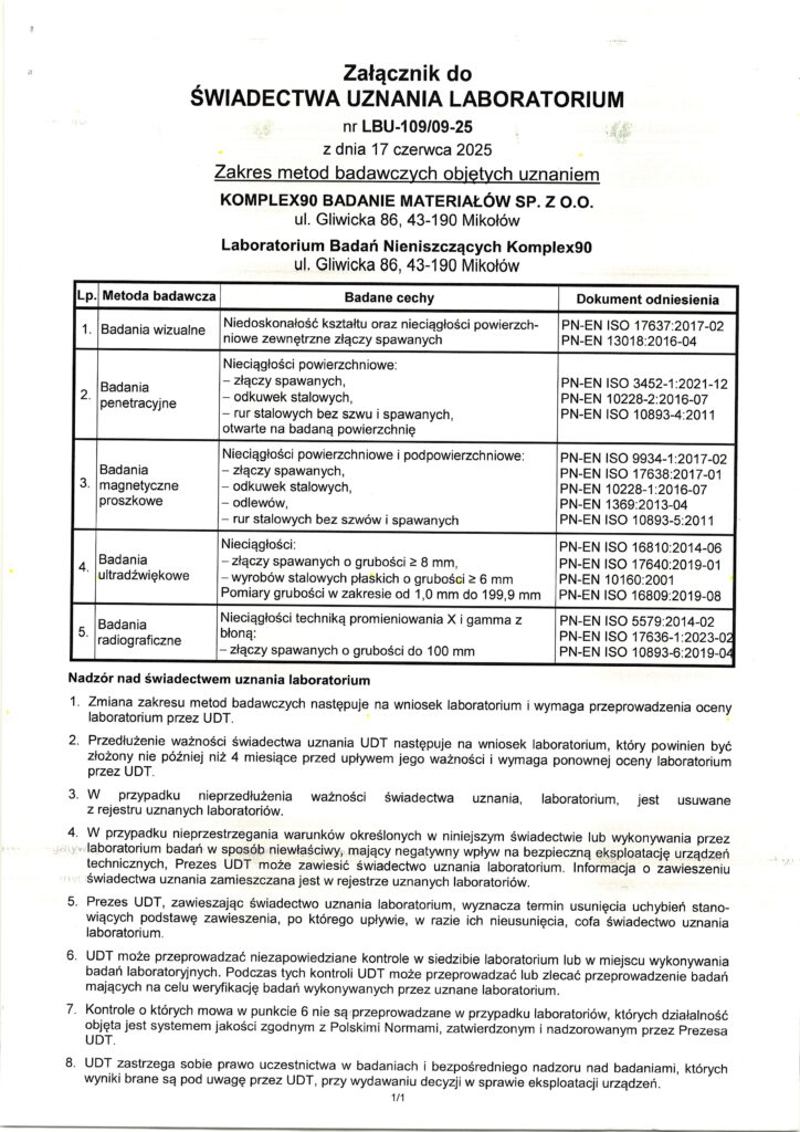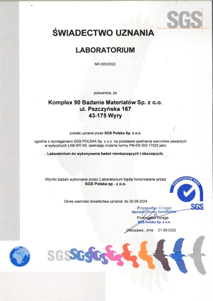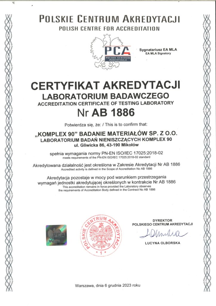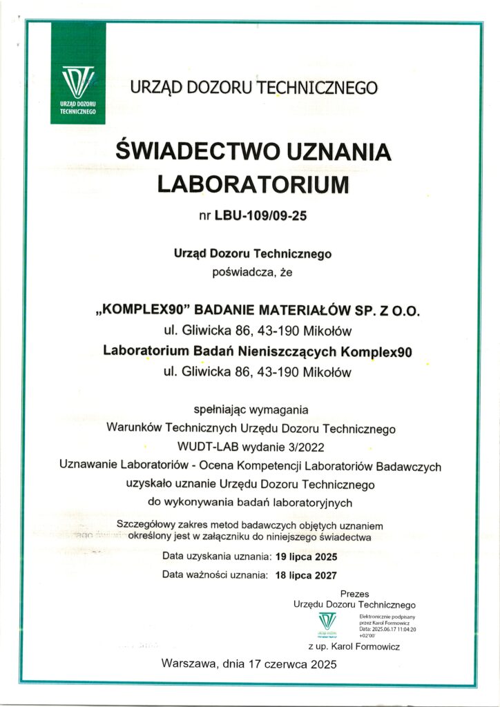 W Laboratorium Badań Nieniszczących Komplex90, jakość i profesjonalizm są fundamentami naszej działalności. Jesteśmy dumni, że nasze zaangażowanie w doskonałość jest potwierdzone przez wiodące instytucje, co świadczy o naszym nieustannym dążeniu do zapewnienia usług na najwyższym poziomie. Poniżej prezentujemy przegląd naszych certyfikatów, które stanowią potwierdzenie naszych umiejętności, wiedzy oraz wysokiej jakości wykonywanych przez nas badań i usług.